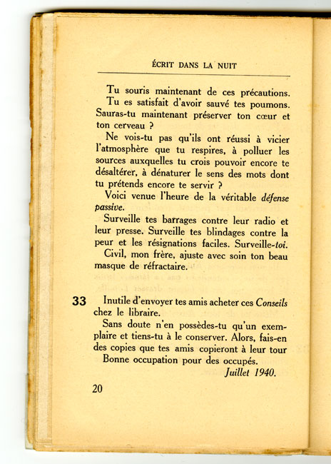 L’une de ses invitations lancées aux Parisiens concerne la diffusion de ses écrits. Il invite ceux qui ont les précieux feuillets entre leurs mains à les recopier le plus discrètement possible pour les distribuer autour d’eux avec ce clin d’œil complice « bonne occupation pour des occupés ». Des extraits ont été lus par Maurice Schumann à la BBC.