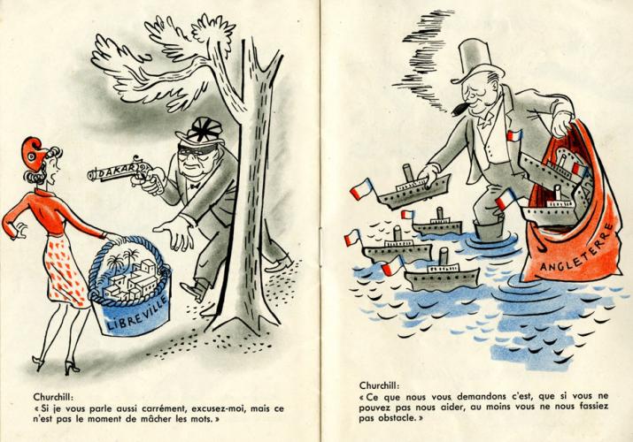 Affiche de propagande du gouvernement de Vichy vilipendant le Premier ministre anglais Winston Churchill et le Général de Gaulle après l’échec de la tentative anglo-gaulliste de ralliement de l’A-OF à Dakar, 23-25 septembre 1940.