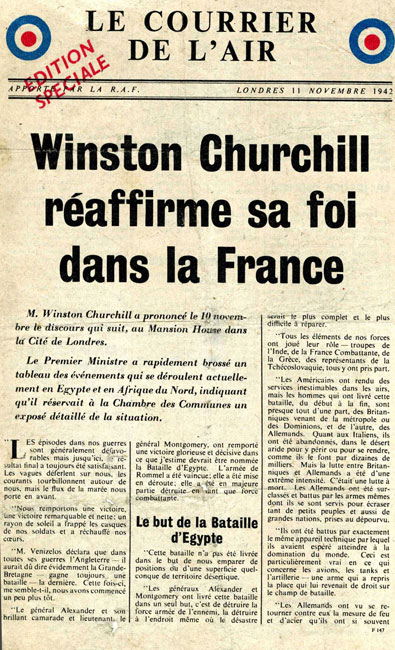 Le Courrier de l’air, édition spéciale du 11 novembre 1942 présentant la déclaration de Winston Churchill, Premier ministre anglais concernant la bataille engagée en Égypte et en Afrique du Nord.