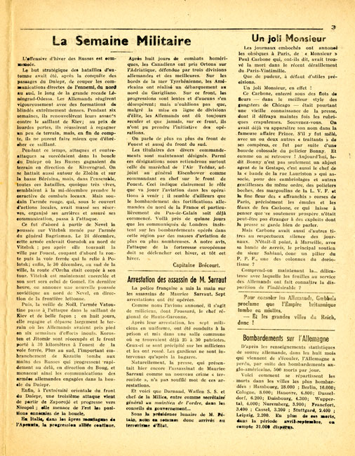 Il appelle à garder espoir au seuil de l’année 1944 que l’on espère celle de la Libération ; en page 4 outre l’armée française de la Libération en Afrique du nord prête pour les opérations en Europe, sont évoquées les mesures d’épuration;