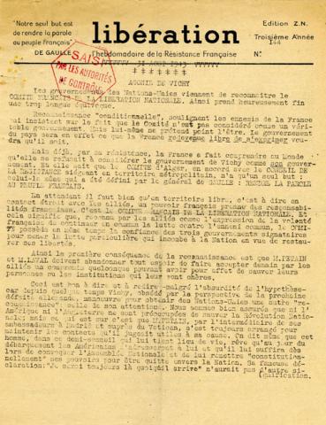 Libération, n°144, édition zone nord du 31 août 1943 portant le tampon “saisi par les autorités de contrôle”.